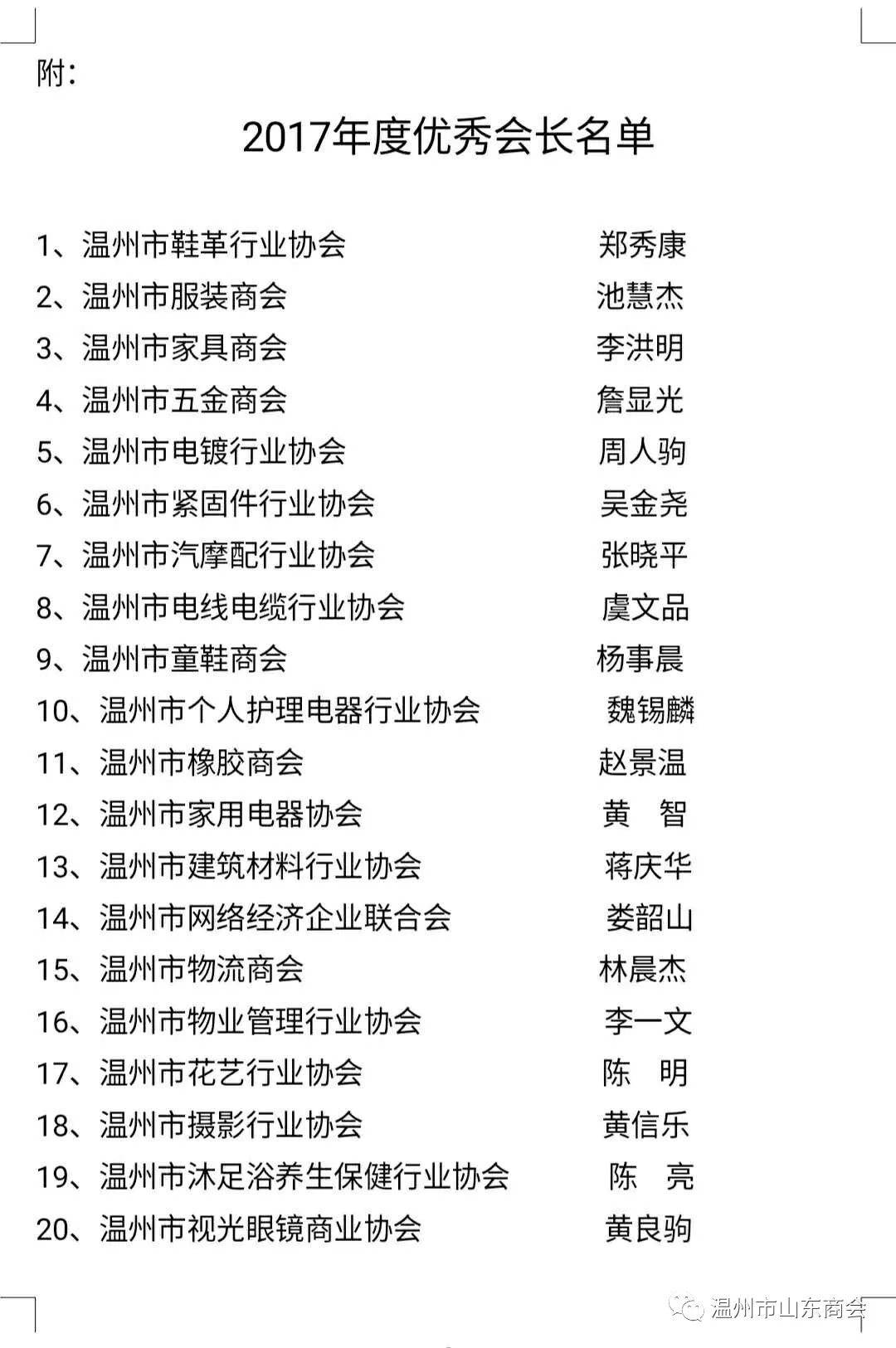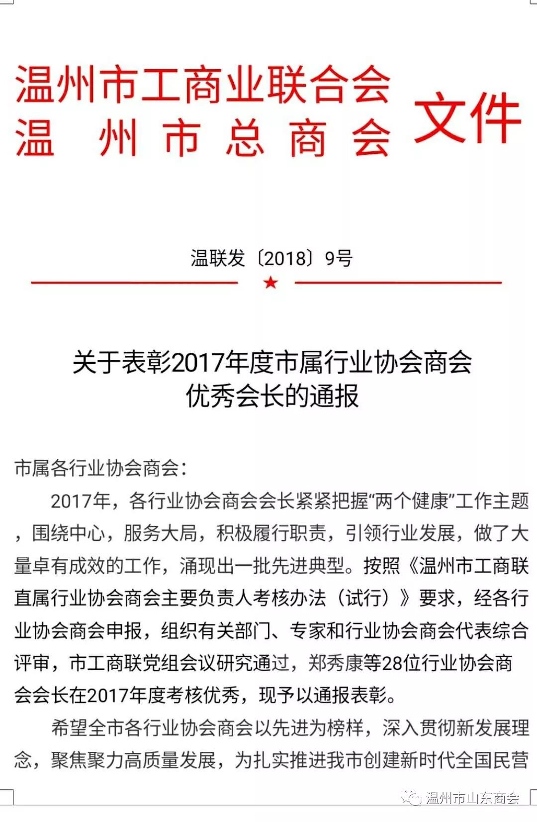 温州市工商联昨天发文,通报表彰2017年度市属行业协会商会优秀会长,在30多家温州异地商会中,只有4家商会入榜,其中包括山东商会会长刘广升。同时,温州电视台新闻综合频道在昨晚20:15分播出了刘广升的《追求卓越恪守诚信》报道专题片。