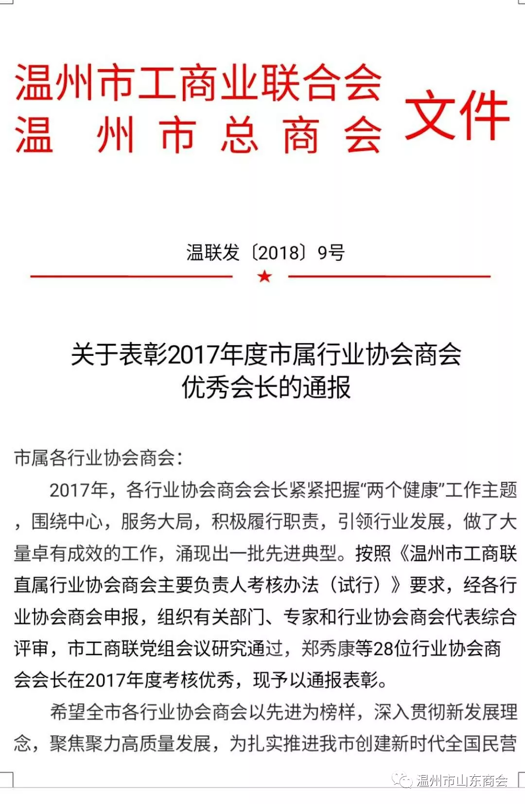 温州市工商联昨天发文,通报表彰2017年度市属行业协会商会优秀会长,在30多家温州异地商会中,只有4家商会入榜,其中包括山东商会会长刘广升。同时,温州电视台新闻综合频道在昨晚20:15分播出了刘广升的《追求卓越恪守诚信》报道专题片。